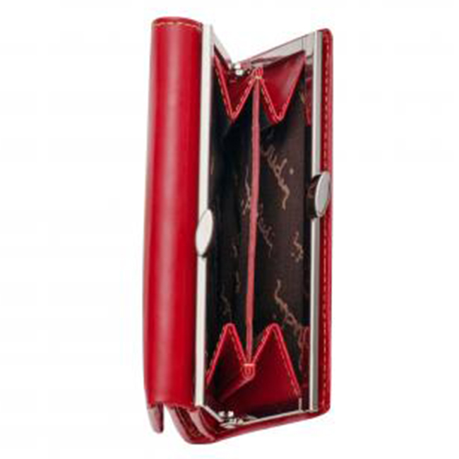 - Червено дамско портмоне с покритие от лак. Вътрешната част е от ествествена кожа.