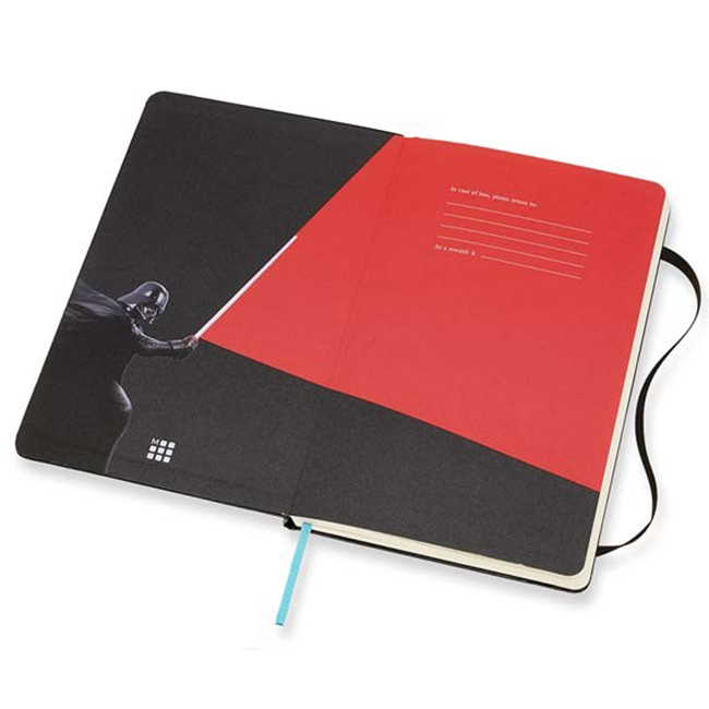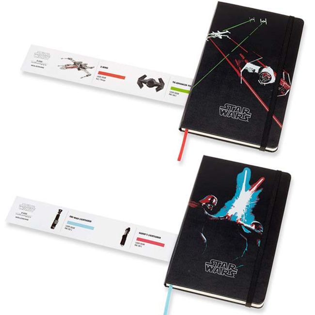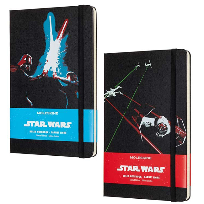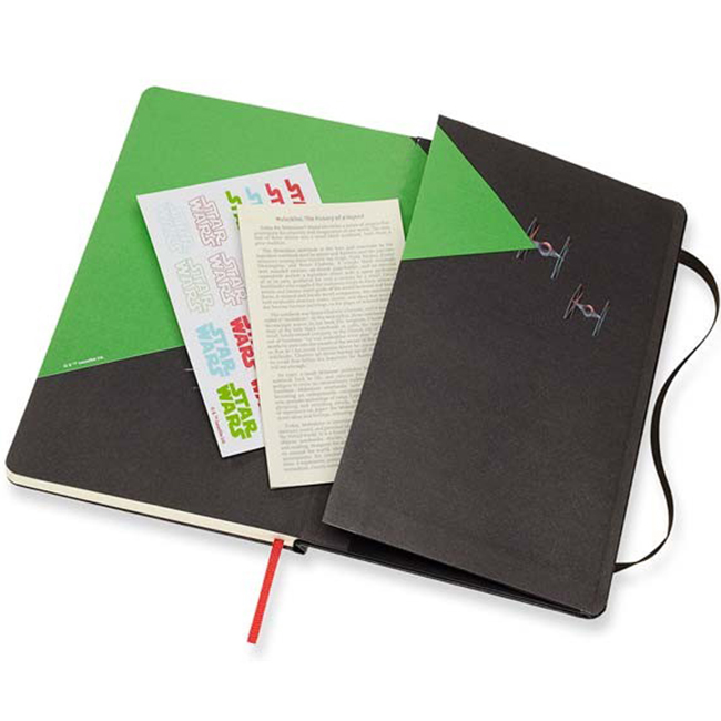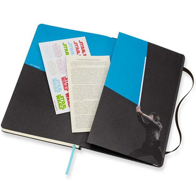 Тефтер Star Wars - част от лимитирана серия, вдъхновена от култовата сага Междузвездни войни. В черния класически кожен тефтер на Молескин "Междузвездни войни, Дуел с лазерни мечове" можете да записвате всяка своя гениална мисъл и уникална идея, да скицирате вашите модели или просто да организирате всекидневните си ангажименти, като към тефтера като комплимент са включени страници с полезна информация, както и комплект тематични самозалепващи се стикери с различни напомнящи символи.Произведен е по най-високите стандарти и с най-качествени материали. "...Нека Силата бъде с теб!"