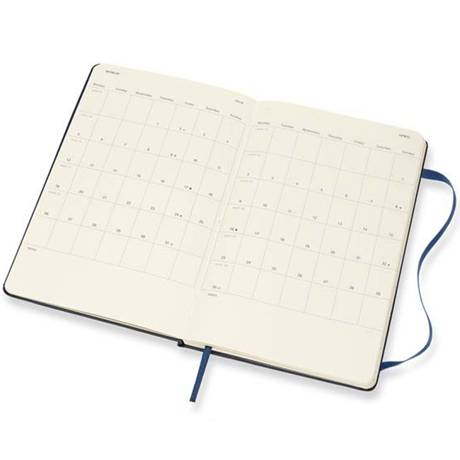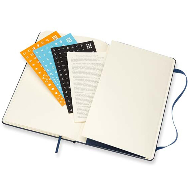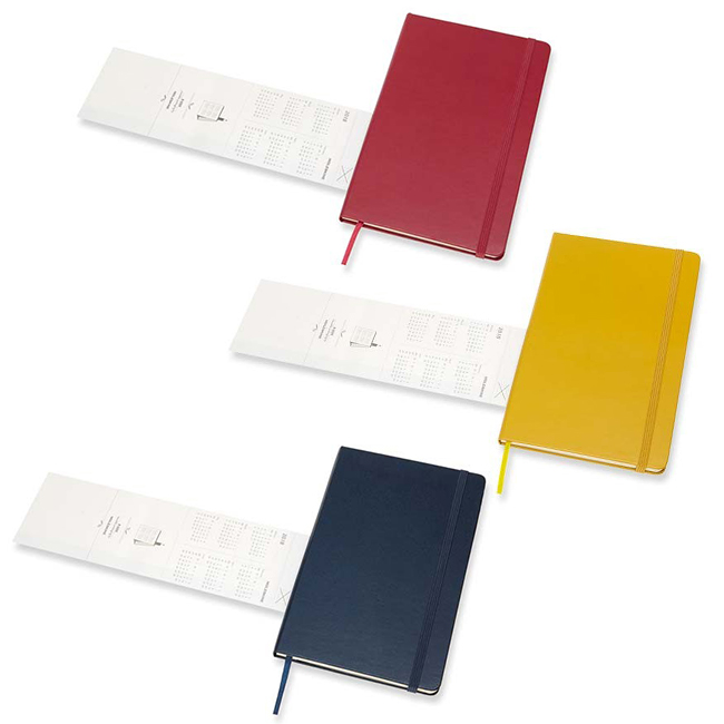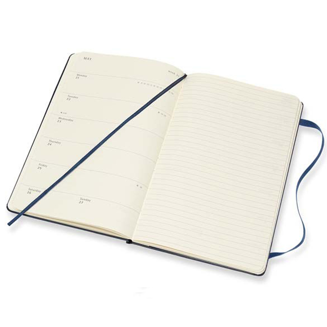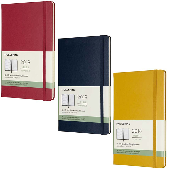 12 месечен тефтер - органайзер/седмичник Moleskine за 2018 година с твърди корици в класически А5 формат (13 х 21 см.). Дните от седмицата в органайзера е организирана на една страница в хоризонтален изглед (в ляво) и линирана съседна страница, подходяща за бележки и коментари (в дясно). Включени са също така страници с полезна информация, както и комплект самозалепващи се стикери с различни напомнящи символи-илюстрации.