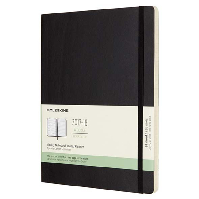 Голям черен 18 месечен тефтер - органайзер Moleskine с меки корици и дати за периода от юли 2017 до декември 2018 година.