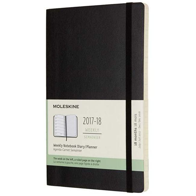 Черен 18 месечен тефтер - органайзер Moleskine с меки корици и дати за периода от юли 2017 до декември 2018 година.