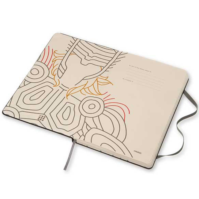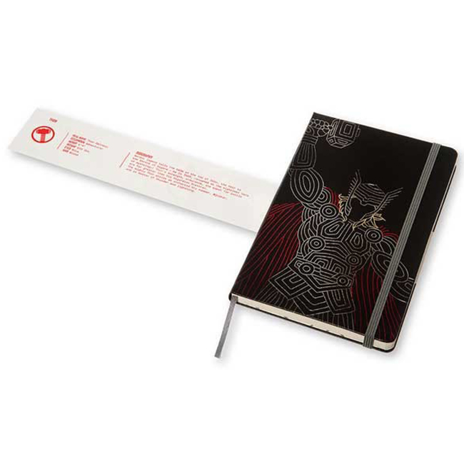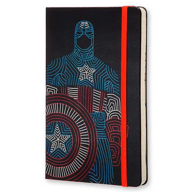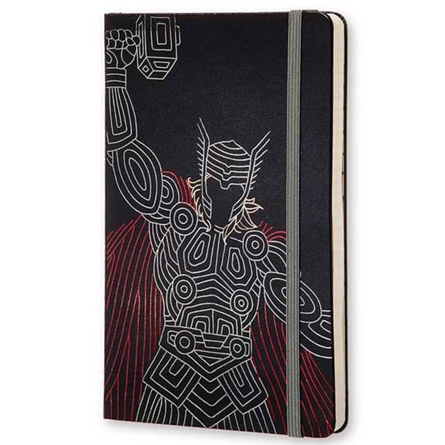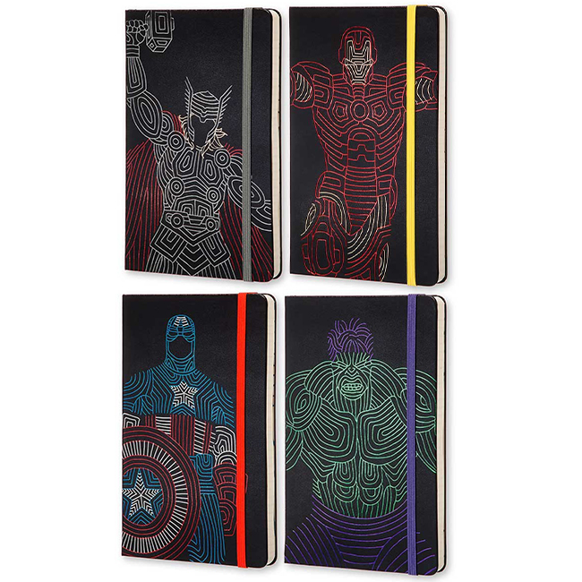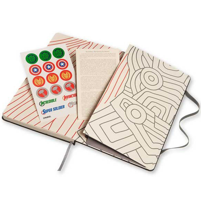 Голям тефтер Moleskine част от лимитирана серия, вдъхновена от едноименния американски супергеройски филм "The Avengers", включващ едни от най-популерните герои на Марвел (Marvel Comics) - Железния човек, Непобедимия Хълк, Тор – Богът на гръмотевиците, Капитан Америка, Хоуки и Черната вдовица. Като комплимент в комплект с тефтера ще намерите и комплект самозалепващи се стикери с различни напомнящи символи.