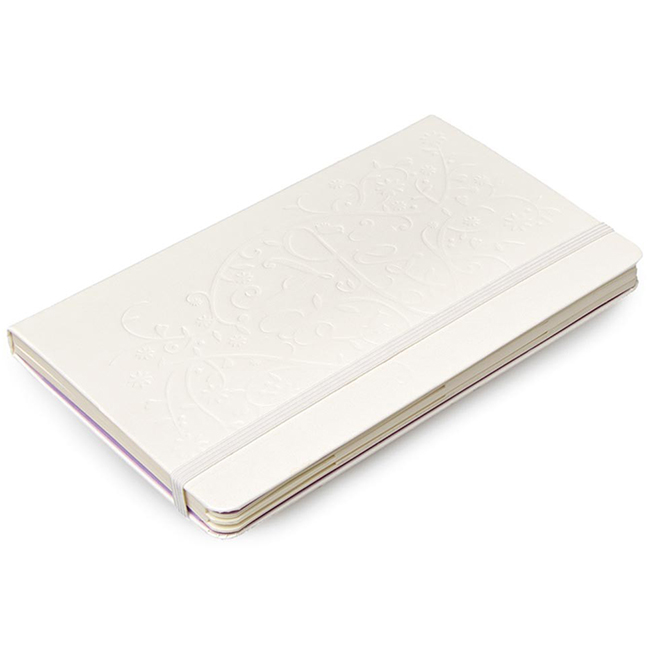 С шикозни твърди перленобели кожени корици с тематична релефна декорация, с преплетена в нея култова фраза "Yes, I do" (Да, съгласна съм) и три виолетови текстилни показалки и допълнително затваряне с ластик.