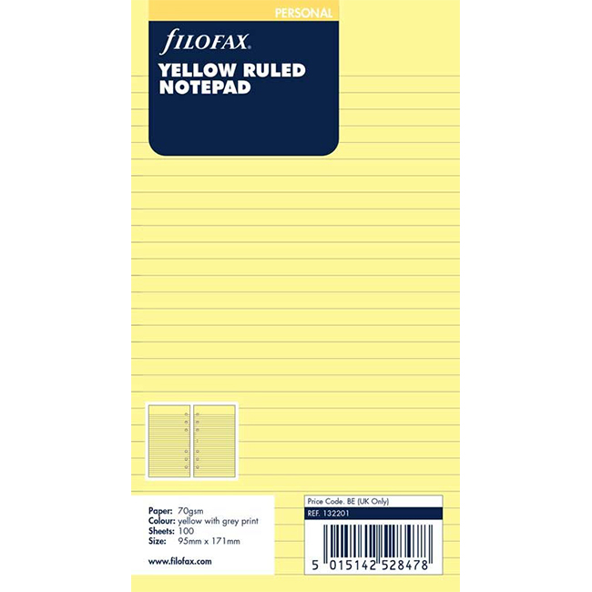 Пълнител за органайзер Filofax Personal с 100 жълти линирани листа - широки редове