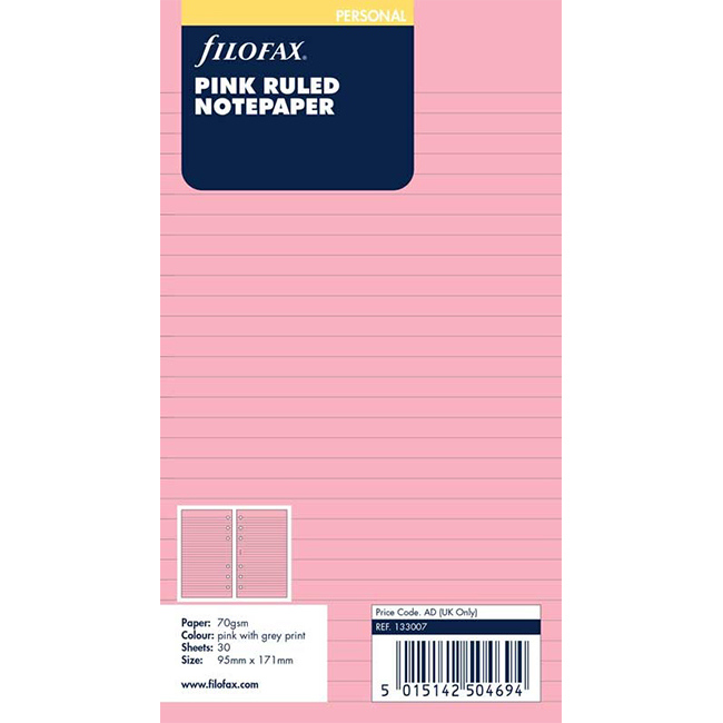 Пълнител за органайзер Filofax Personal с 30 розови линирани листа - широки редове