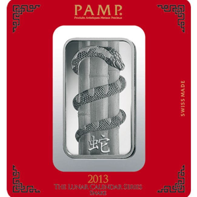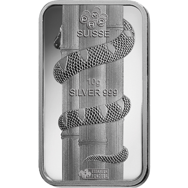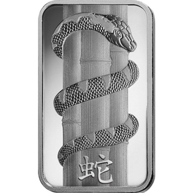 Сребърното кюлче Годината на Змията е от чисто сребро 999/1000 и е с тегло 10 грама. Според китайския лунен календар змията е символ на грациозност, интелигентност и чар. На лицето на кюлчето е изобразена змия увиваща се около стълб, на който е гравиран китайския символ за змия. На гърба се вижда задната част на змията, увита около стълба и печатите за чистота на среброто и тегло, с марката на швейцарската рафинерия PAMP.
