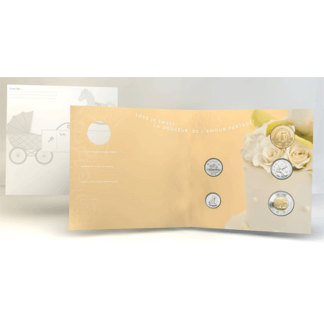 Подаръчният комплект за сватба, който се състои от 5 монети е чудесен подарък за новото семейство. В комплекта е включена уникална монета от 1 долар, която е изработена и налична само в този подаръчен комплект и е единствена по вида си - два гълъба с допрени човки, в израз на дълбока нежност. Монетите в подаръчния комплект никога не са пускани в обращение и са с традиционен дизайн.
