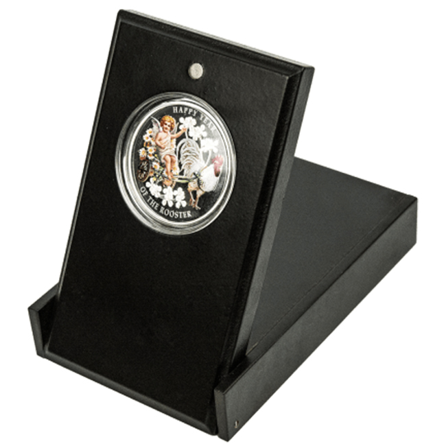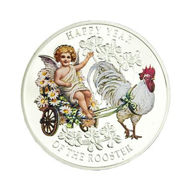 - Сребърна монета "Грижовност и Вярност, Годината на Петела 2017" е с цветно покритие и изобразява херувим в каляска от цветя, теглена от петел