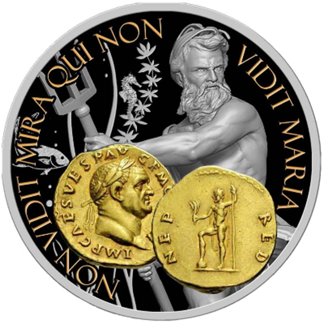 Сребърна монета Нептун, Богът на океаните и водите, с частично позлатяване