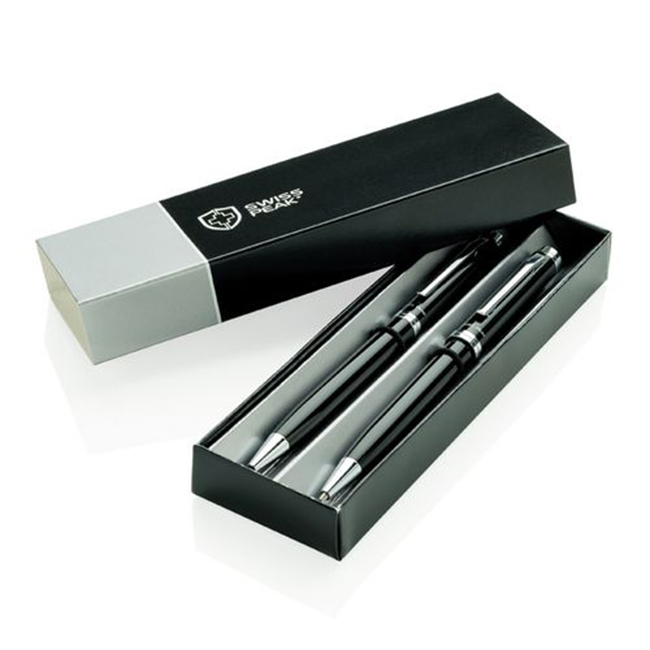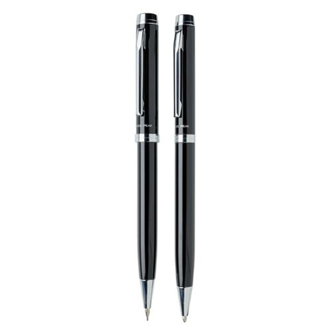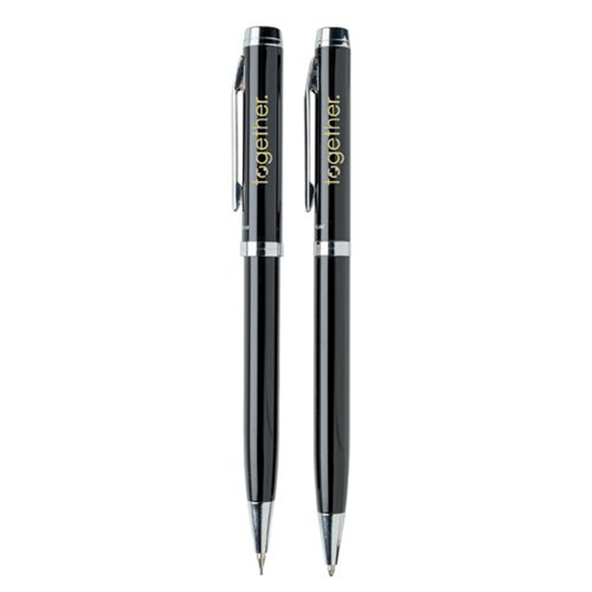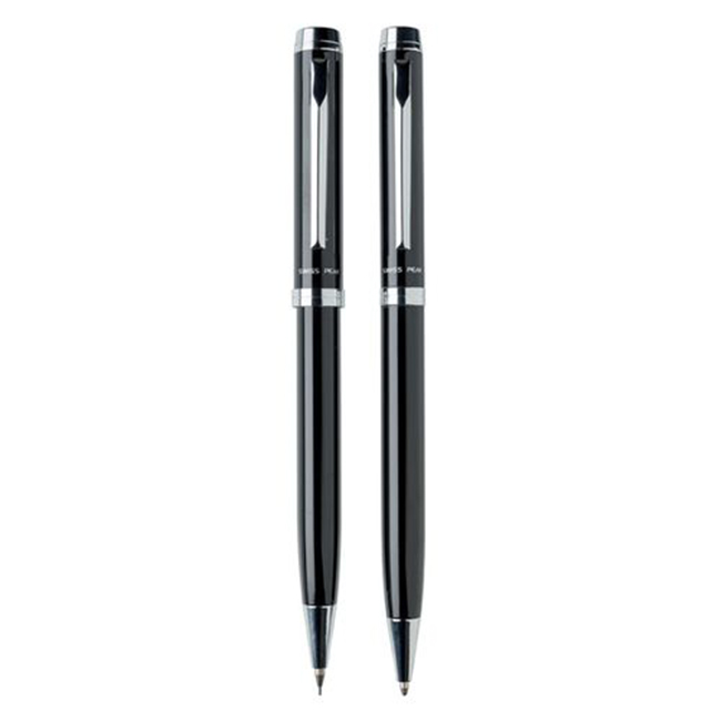 - Комплект елегантни химикалка и механичен молив с класически дизайн в черно и сребро.