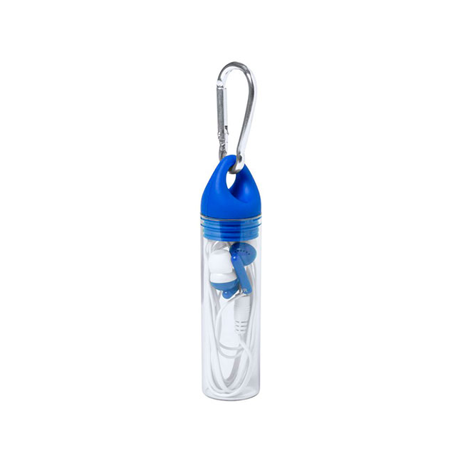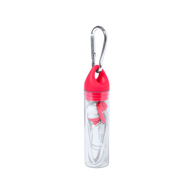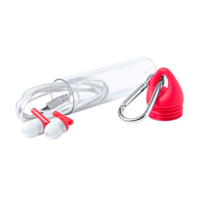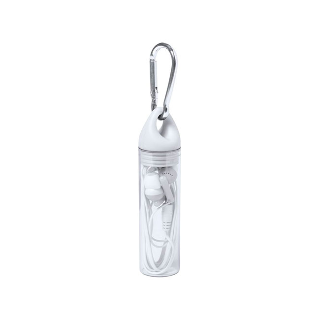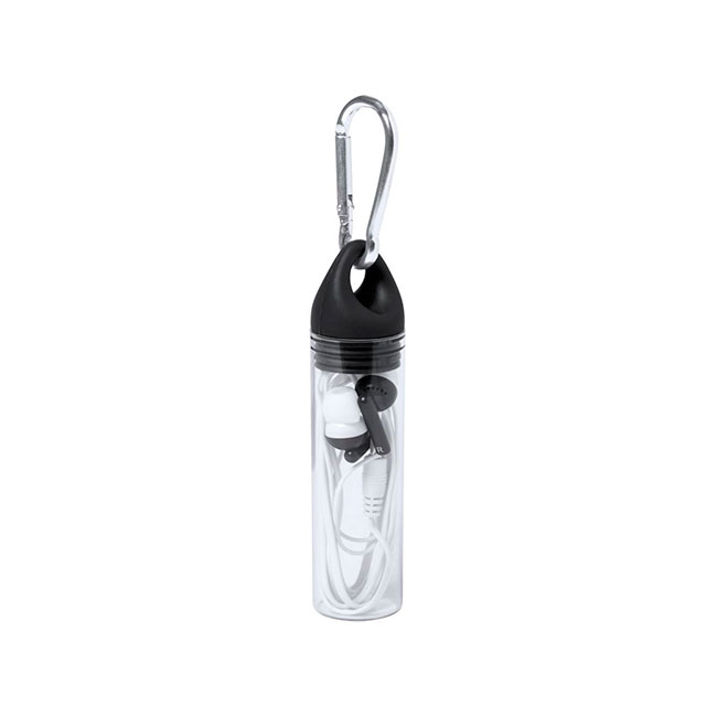• Слушалки в пластмасова цилиндрична кутия с карабинер.