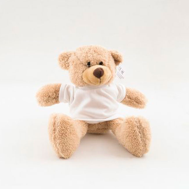 • Плюшено мече с бяла тениска подходяща за надписване чрез ситопечат.