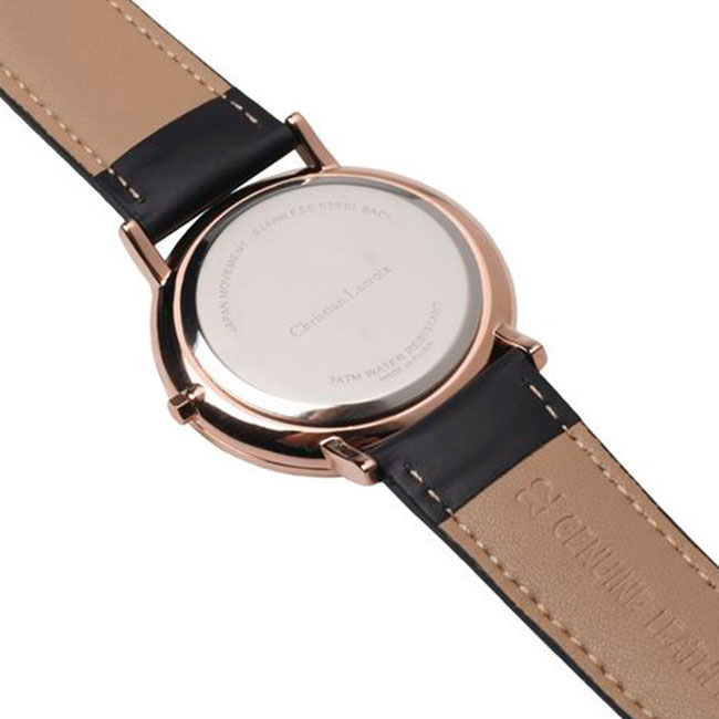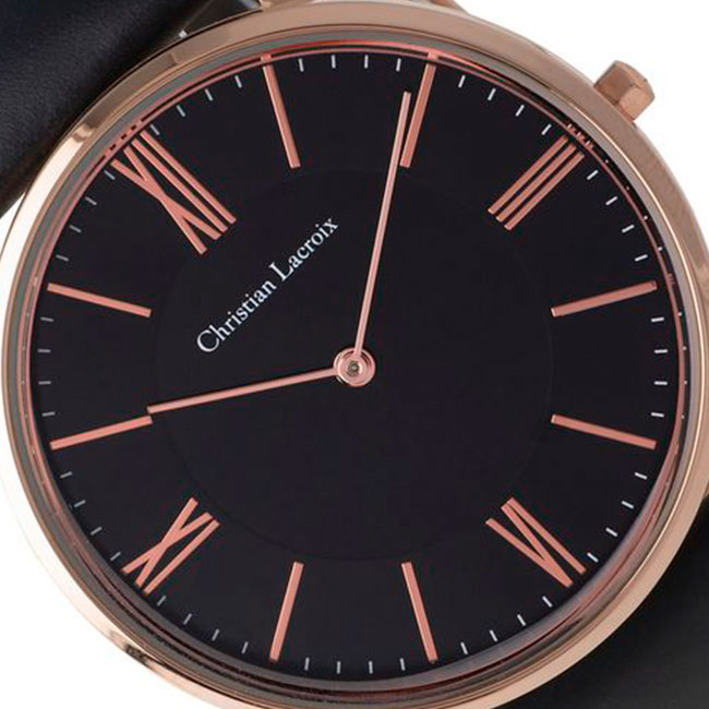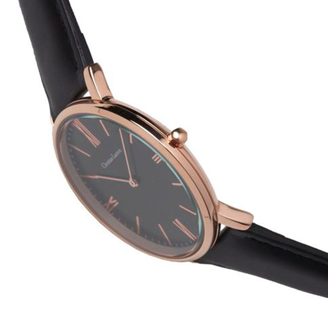 - Стилен ръчен часовник с циферблат с римски цифри и златисти метални части.