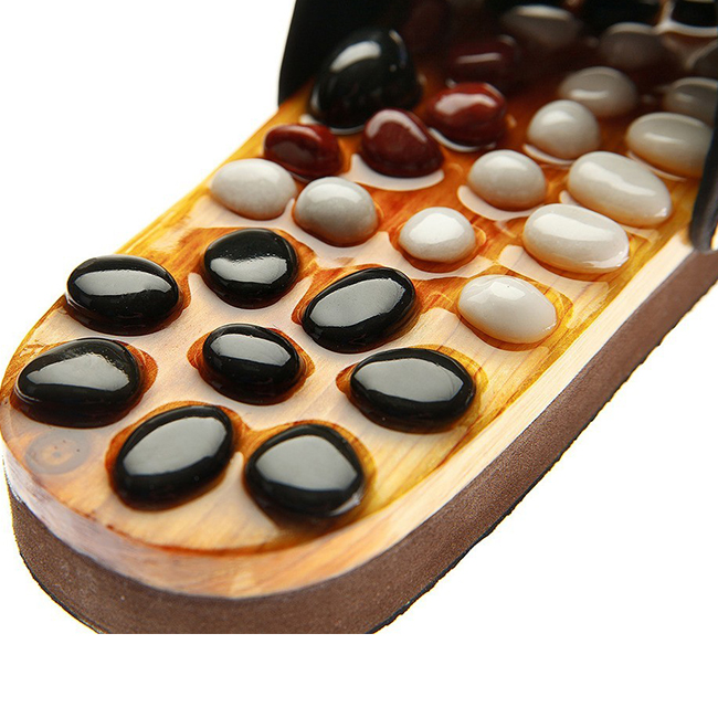 Масажиращите чехли на CASADA са изработени от 100% естествени материали. С помощта на органични смоли, върху дървена подметка са поставени общо 54 естествени камъка от нефрит, яспис и магнетит.
