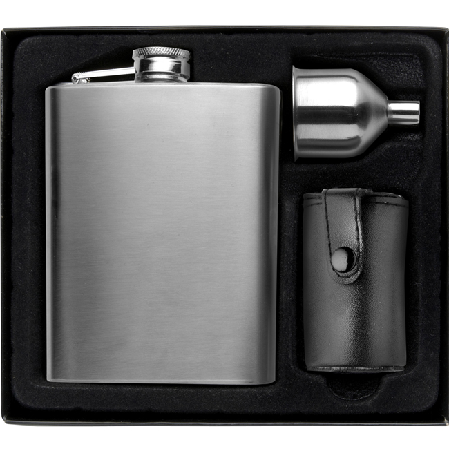 Комплекта включва фласк за алкохол (220мл), четири чашки и фуния, изработени от неръждаема стомана.