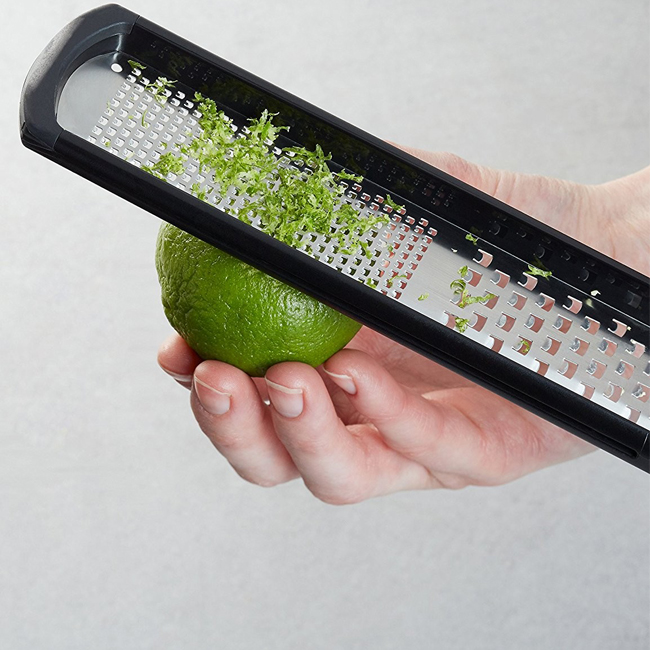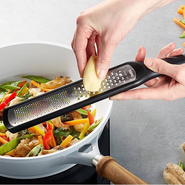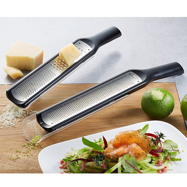 С две режещи повърхности - за по едро и за фино настъргване. За пармезан, джинджифил, шоколад, лимонова кора, канела, моркови и други твърди храни. Изключително острите лазерно изрязани остриета гарантират безпроблемно настъргване. Режещата повърхност е дълга и извита навътре, което прави настъргването бързо, ефективно и безопасно. Дали на люспи или на много ситно настърган: двете триене повърхности на глоба и груби ренде доставят перфектни резултати на пармезан, джинджифил, шоколад, лимонова кора, моркови и други твърди храни от изключително остри ножове лазерно изрязани.