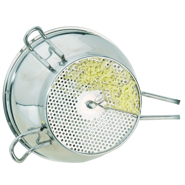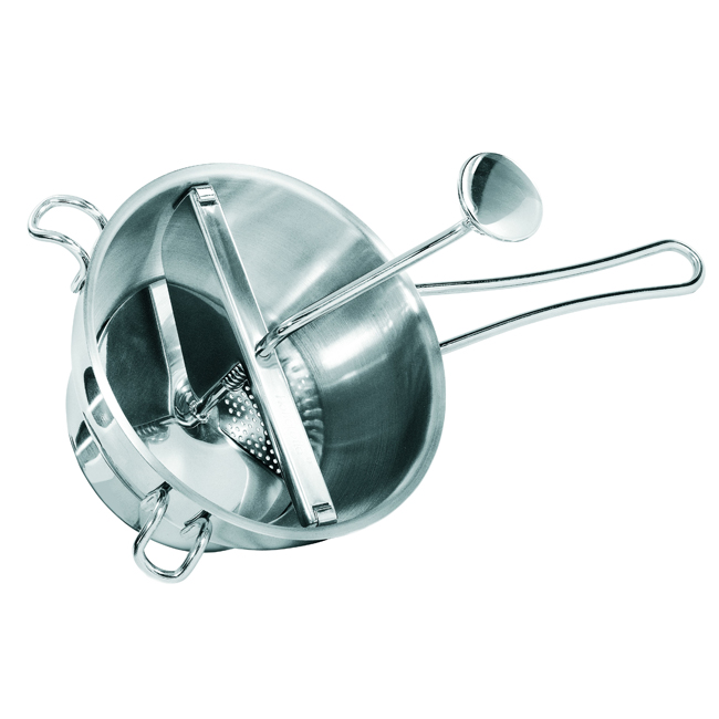 Професионален механизъм и високо солидно качество. Благодарение на грапавата повърхност и новата технология на дисковете, вече можете да пюрирате и влакнести зеленчуци като праз лук, аспержи или други. Пюрирането на сурови ябълки също не е проблем. Двата диска (2 и 3 мм) се сменят бързо и лесно. Уникалното при този уред е също и частта (отдолу), играеща ролята на чистачка, която събира всички остатъци от храна по дисковете. За по-голяма стабилност и безопасност, уредът разполага с 3 кукички, които са разположени, така че мелничката е поставена равномерно върху уреда за готвене и остава далеч от пюрираните зеленчуци.