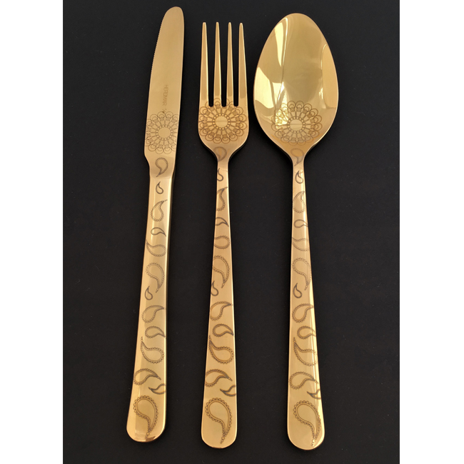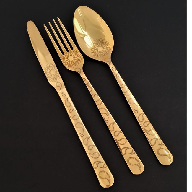 Приборите за хранене със златно покритие имат покритие с дебелина от 3 или 4 микрона 24 карата злато
