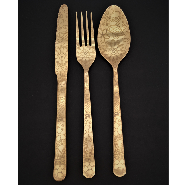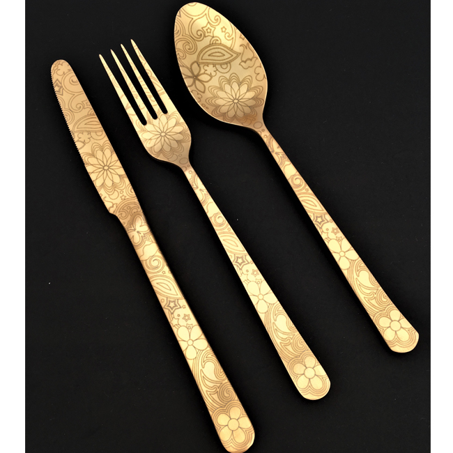 • Приборите за хранене със златно покритие имат покритие с дебелина от 3 или 4 микрона 24 карата злато