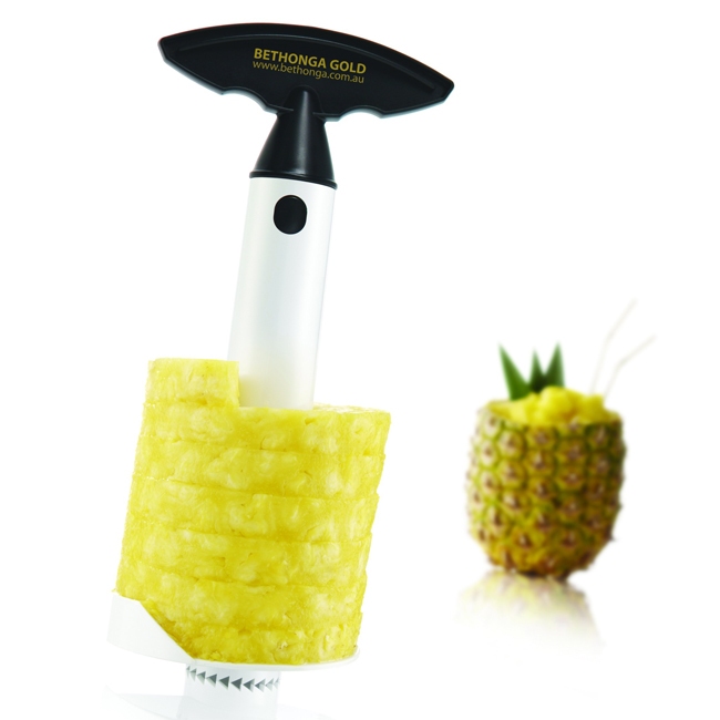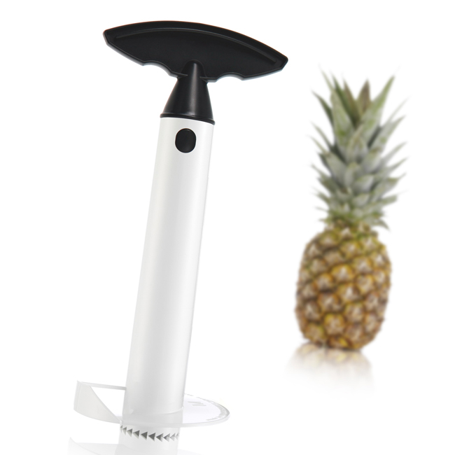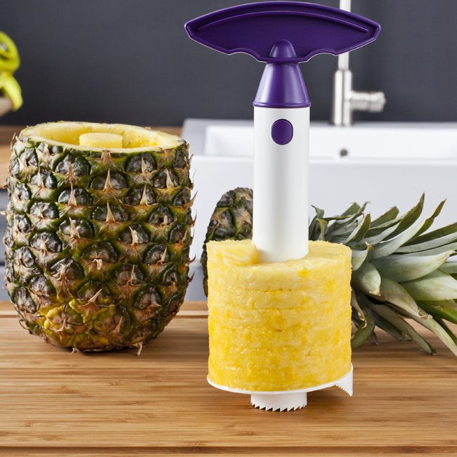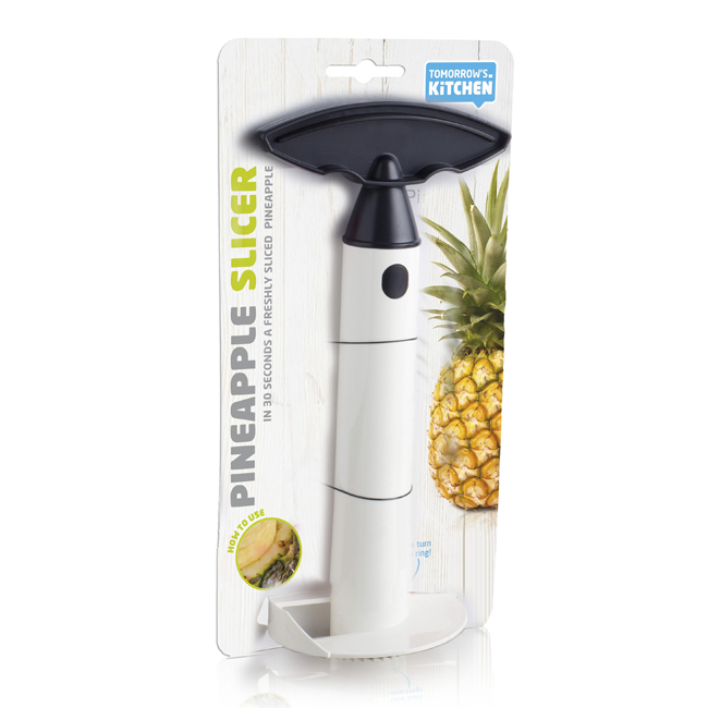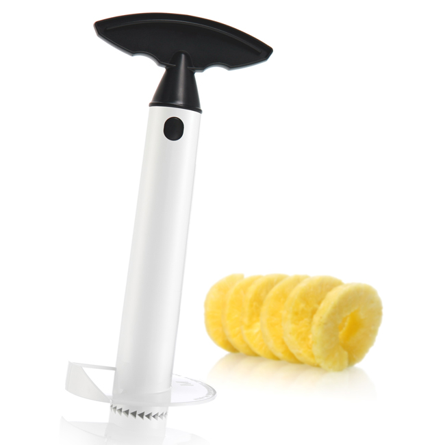Резачка за ананаси обелва, изважда и нарязва ананас само за 30 секунди. Тя работи като тирбушон, като изважда плода в перфектно оформени пръстени. Удобната дръжка осигурява контролирано движение за рязане на ананасовите пръстени - едно кръгче, по-голямо парче или целия ананас на веднъж. Новият захват осигурява здраво задържане и може да бъде освободен с едно натискане на бутона. Ананасовата обвивка остава непокътната, за да я използвате за сервирането на десерта, плодовата салата или плодов коктейл. Пресни, сочни, вкусни - идеални ананасови парчета за по-малко време, отколкото е нужно да отворите консерва!