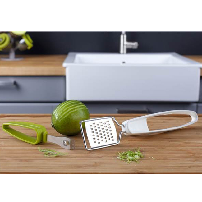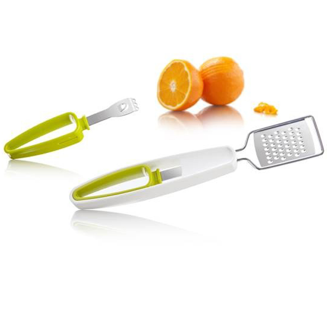 Със своите остриета от неръждаема стомана, рендето и приборът за кора от цитруси са идеални помощници във Вашата кухня. С тях лесно ще настържете или нарежете на тънки ивици кората на портокал, лайм, лимон и др.
