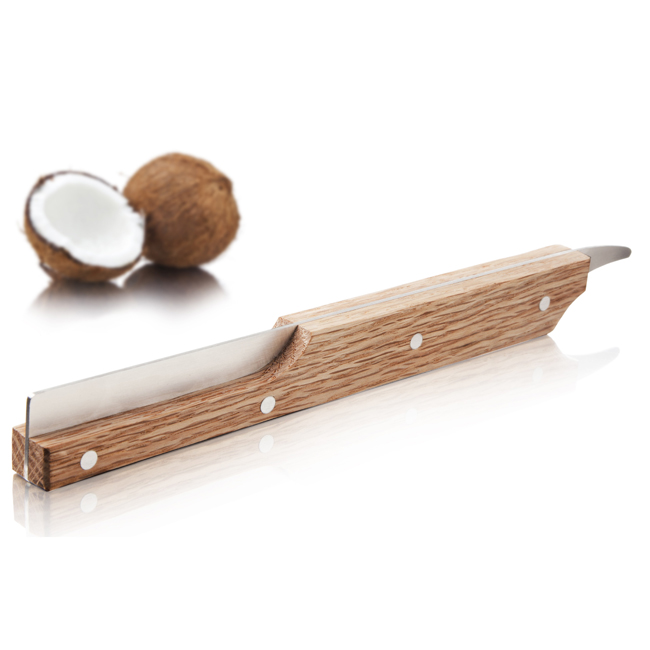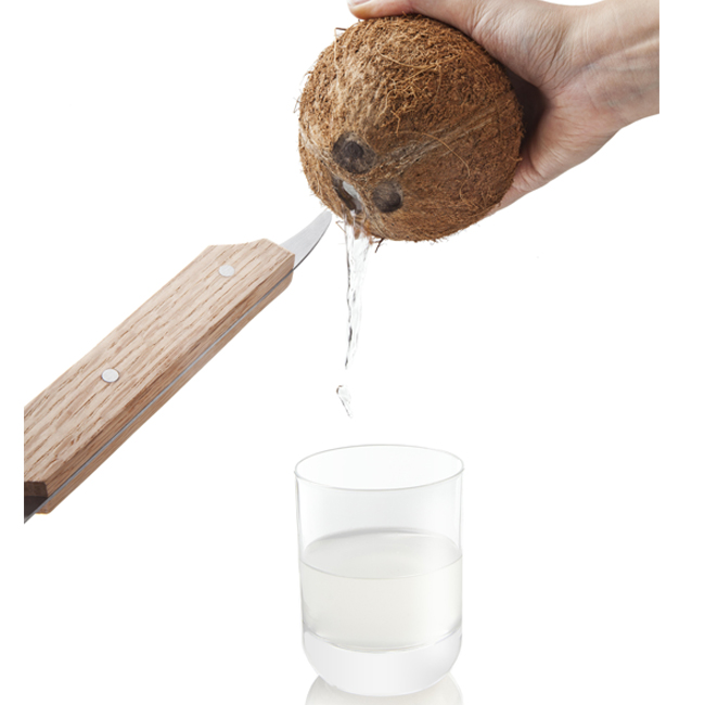 С опипване намерете коя от трите дупки е най-мека и в нея завъртете върха на прибора. След като направите отвор, оставете за минута – две кокосовия сок да изтече в чаша. С обратната страна на прибора нанесете средни по сила удари в централната част на ореха – при появата на пукнатина в черупката започвате да удряме в страни от нея до пълното разделяне на две части. С остър нож можете да изрязвате кубчета от ореховата ядка.