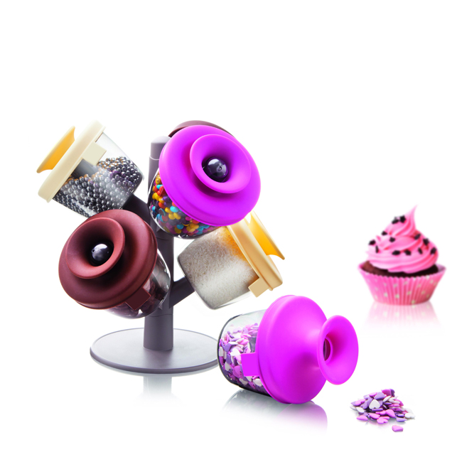 Комплектът за декорация на сладкиши е практичен начин за съхраняване и разпределяне на всички видове украса. Цветните капаци и патентованата система Oxiloc са специално разработени, за да гарантират, че купите остават херметически затворени. Вашите любими декорации за сладкиши могат удобно да се съхраняват готови за употреба. Когато капакът е "отворен" можете да разпределите съдържанието в ръката си или директно над сладкиша. Комплектът се предлага с удобна, специално разработена стойка, която дава възможност за поставяне на до 9 диспенсера.