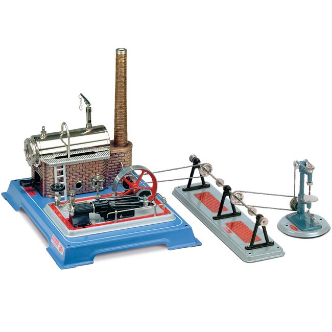 Работещ мини модел на парен двигател - Wilesco D16 в комплект с междинен вал и стационарна пробивна машина. Към вала могат да се добавят още четири модела за задвижване.