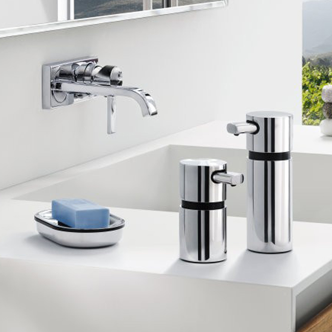 Серия за баня AREO се отличава с овални форми и матово-черен пластмасов елемент на всеки един продукт от серията. Овалната форма на детайла на стенната конзола, детайлите върху сапунерката, и формата на диспенсъра за сапун - всичко това отразява естетическата функция на аксесоари за баня AREO. Този полиран диспенсър за сапун има голям отвор за лесно и удобно зареждане.
