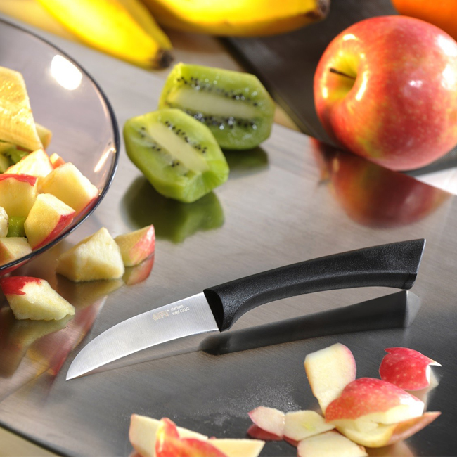 Ножът за белене SENSO е изработен от висококачествена японска стомана и е със стилна и ергономична пластмасова дръжка, която има гумено покритие в долната си част, за да осигури добро сцепление.
