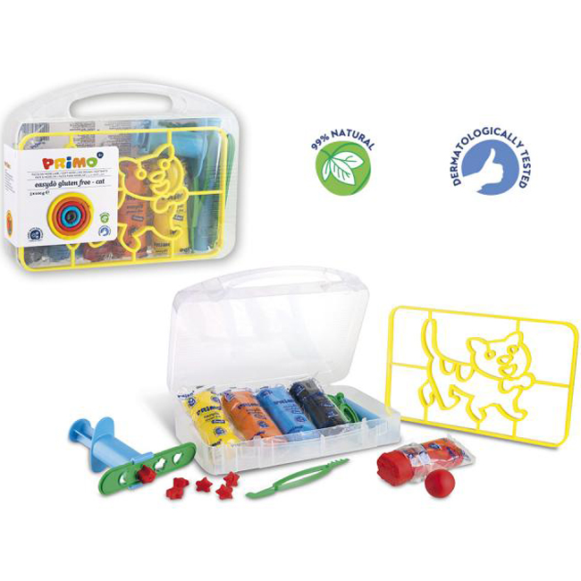 Моделин мек без глутен 5 цв.х 100 г с шаблон Котка, 6 инструмента и подложка