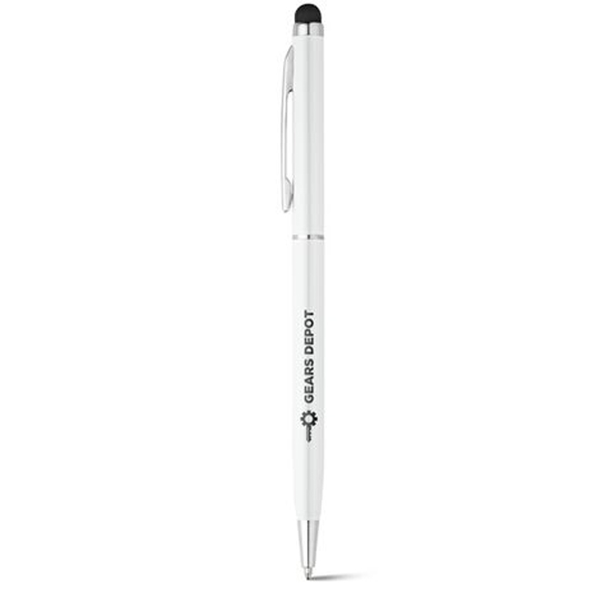 Тънка и лека, метална рекламна химикалка с гумичка за тъчскрийн. Стилен избор, върху който ще личи както пълноцветен печат така и елегантен надпис поставен чрез лазерно гравиране.