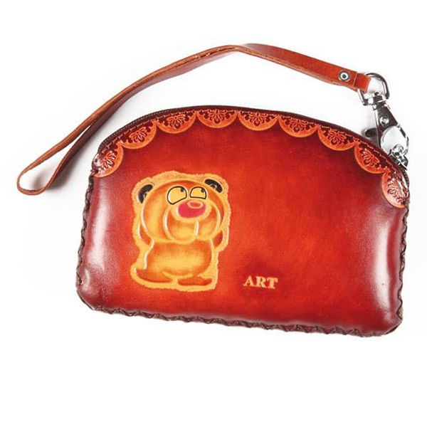 Портмоне, ръчна изработка, естествена кожа, с правоъгълна форма с щампа мече, с цип.