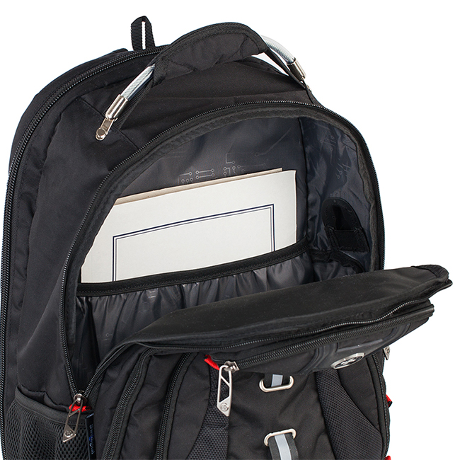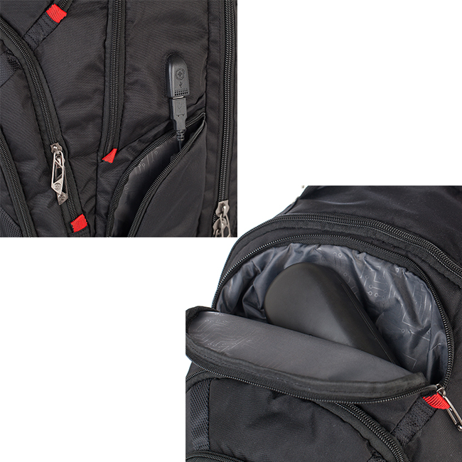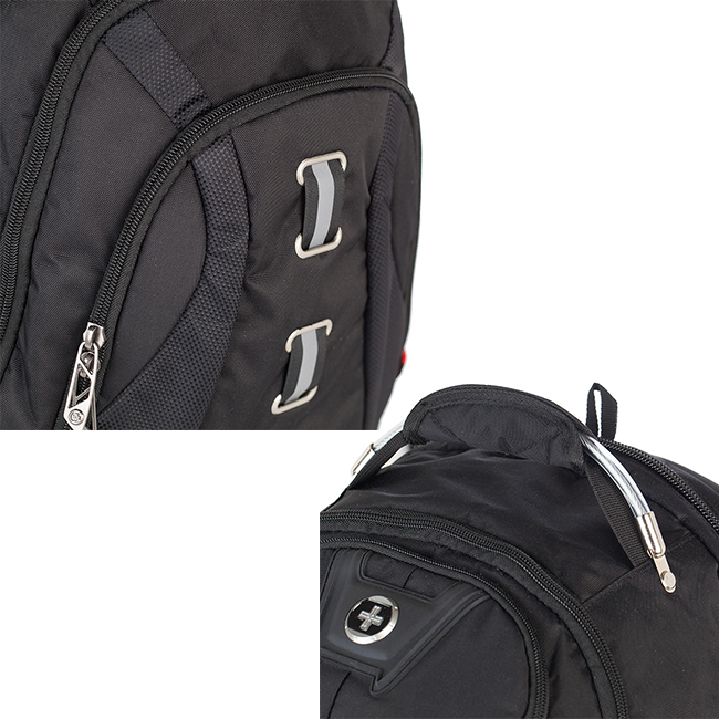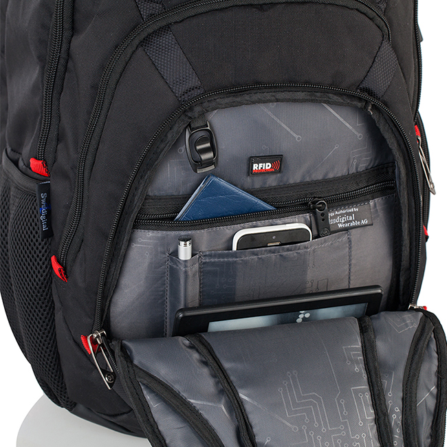 Удобства на раницата: Наличие на USB port; RFID защита за безконтактни карти; Водонепропусклив материал; Основно отделение за лични вещи; Външно отделение органайзер с цип; Отделение за портфейл/портмоне; Защитено отделение за лаптоп 14 инча; Защитено отделение за таблет; Защитено отделение за мобилен телефон; Вътрешно отделение за батерия Power Bank; Джоб органайзер за химикалки; Външен джоб с цип; Джоб за очила; Два външни джоба с цип; Джоб за бутилка/чадър; Джоб за поставяне върху дръжката на куфар; Ципове с лого Swiss Digital; Ключодържател; Ергономични дръжки; Къса дръжка; Допълнителна дръжка; Регулируеми комфортни презрамки; Анатомичен гръб; Уплътнен гръб.