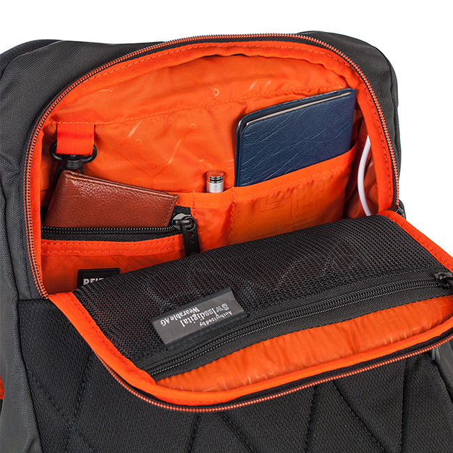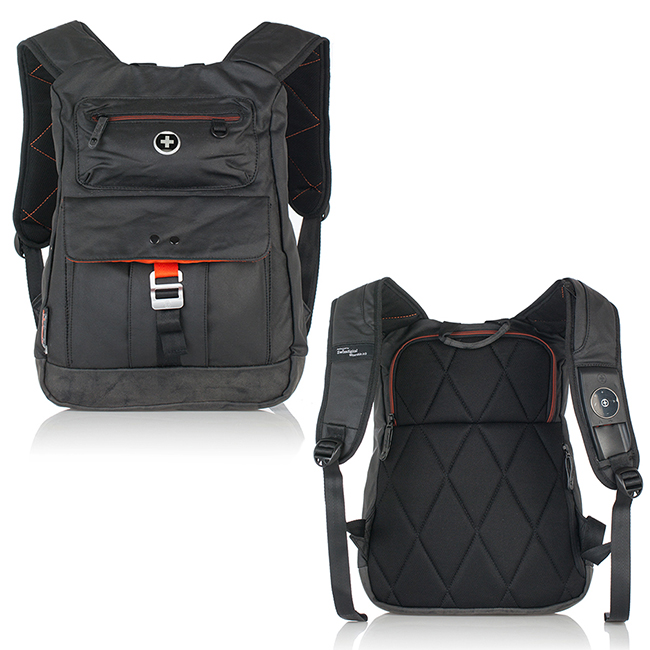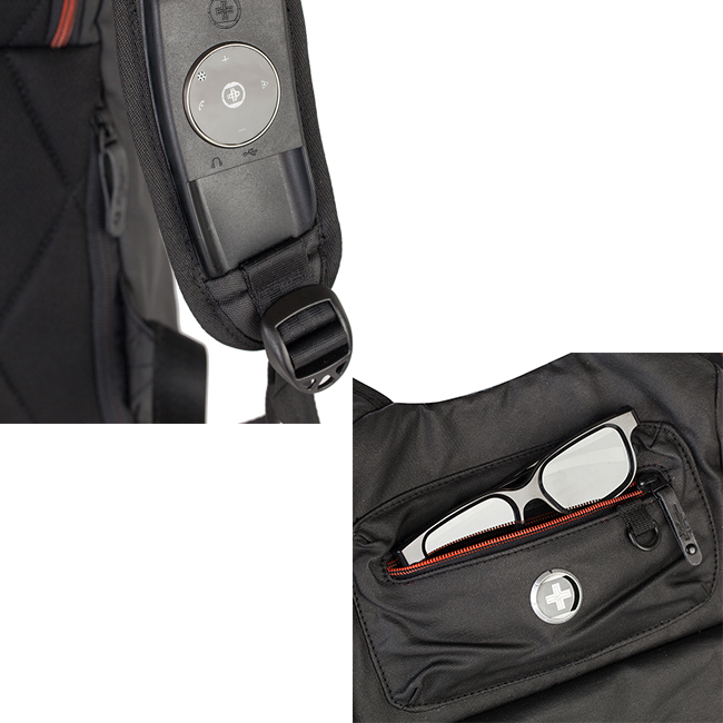 Удобства на раницата: Наличие на USB port; RFID защита за безконтактни карти; Водонепропусклив материал; Toch система за управление; Основно отделение за лични вещи; Външно отделение органайзер с цип; Отделение за портфейл/портмоне; Защитено отделение за таблет; Защитено отделение за мобилен телефон; Вътрешно отделение за батерия Power Bank ; Външен джоб с цип; Джоб за кабел; Ципове с лого Swiss Digital; Ключодържател; Къса дръжка; Ергономични регулеруеми презрамки с USB port; Регулируеми комфортни презрамки; Анатомичен гръб; Уплътнен гръб