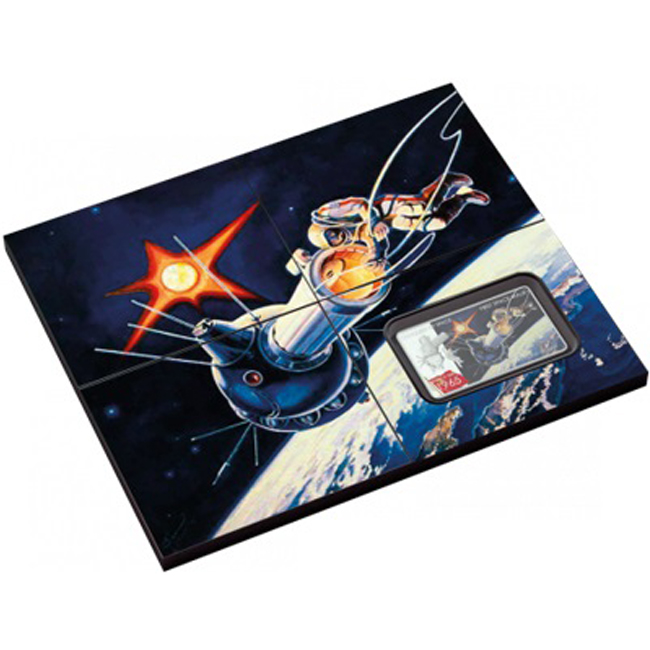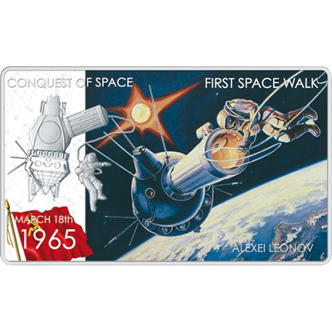 Монетата е опакована в реплика от картина, нарисувана от самия Алексей Леонов. Картината изобразява изторическото събитие Първа разходка в открития космос. Тази монета е с лимитиран тираж от 5 000 бр. за цял свят