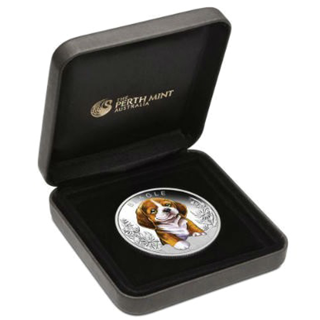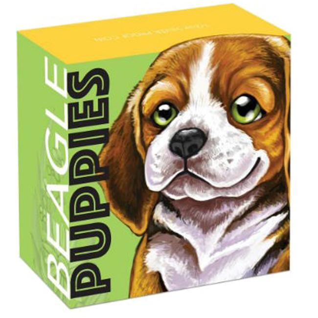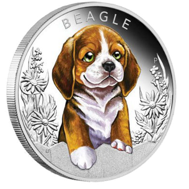 Тази сребърна монета, изобразяваща очарователно кученце от породата Бигъл,
