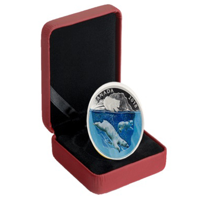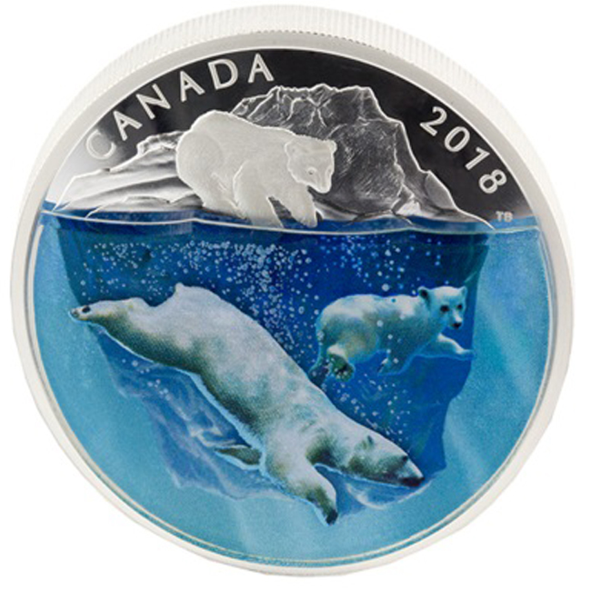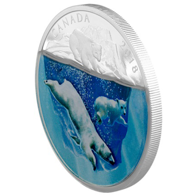 Тази сребърна монета е първата, която представя последната иновация - Dimensional Paint, създавайки илюзията за истинска вода, за да улови 3D-подобен подводен изглед на Полярната мечка.