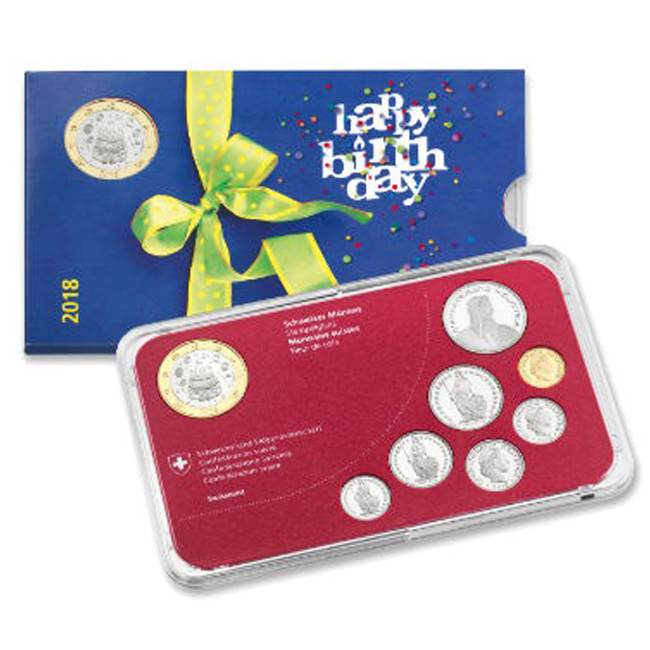 В допълнение към всички разменни монети на Швейцария от текущата година, колекцията съдържа прекрасен медал с торта за рожден ден отпред и текст Честит рожден ден на гърба. Картонената калъфка е проектирана под формата на малка опаковка с отвори.