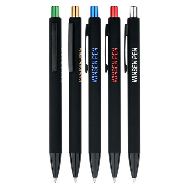 Елегантна рекламна химикалка от алуминии с гумирано покритие. Благодарение на специално метално покритие, вашето лого, надпис или послание може да блести в цвят след лазерно гравиране на химикалката.