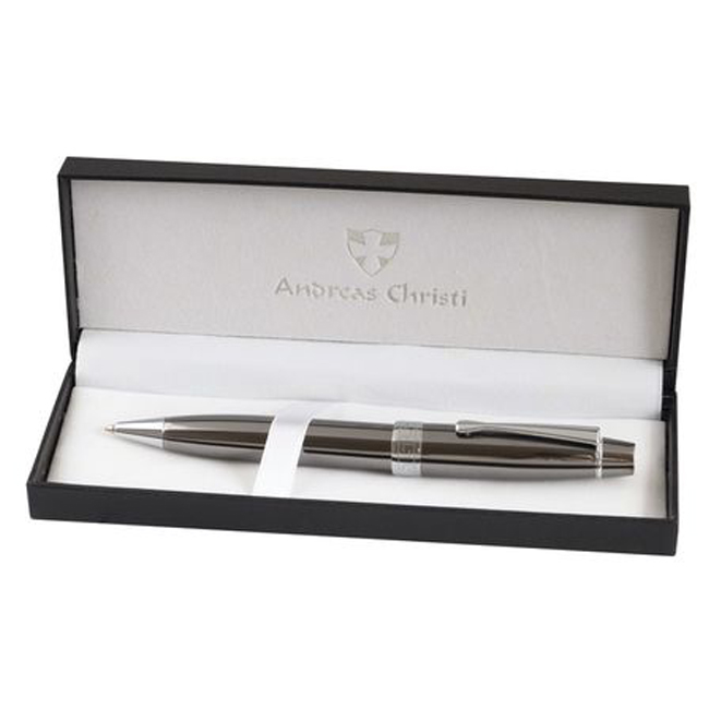 Метална химикалка Andreas Christi модел Nox в кутия. Дебела и масивна химикалка с гръцки мотиви. Има голяма площ за надписване чрез лазерно гравиране.