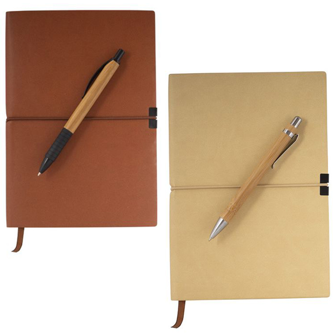 Комплект бележник с меки корици и химикалка с корпус от бамбук.