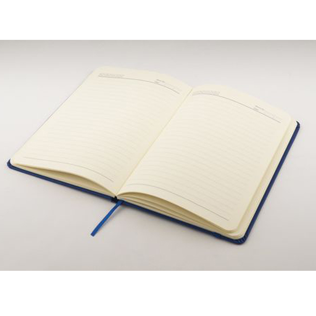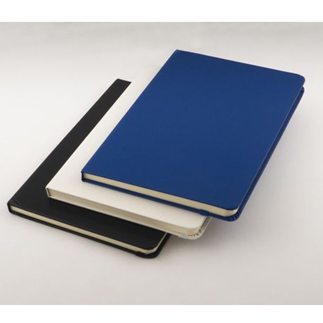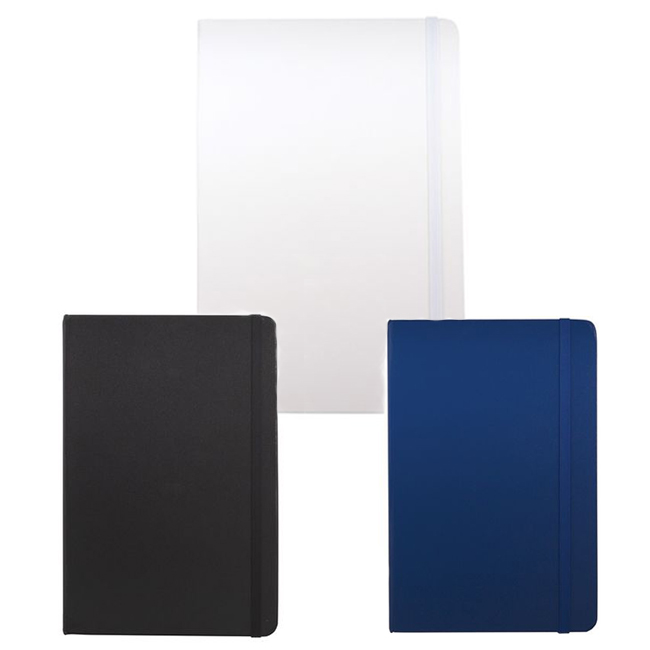 Черен рекламен бележник с твърди корици от еко кожа. Бележникът е с размер А5 (14х21 см) и съдържа 80 тонирани листа на редове. Има възможност да бъде брандиран чрез ситопечат или топъл печат (преге).