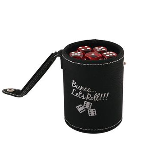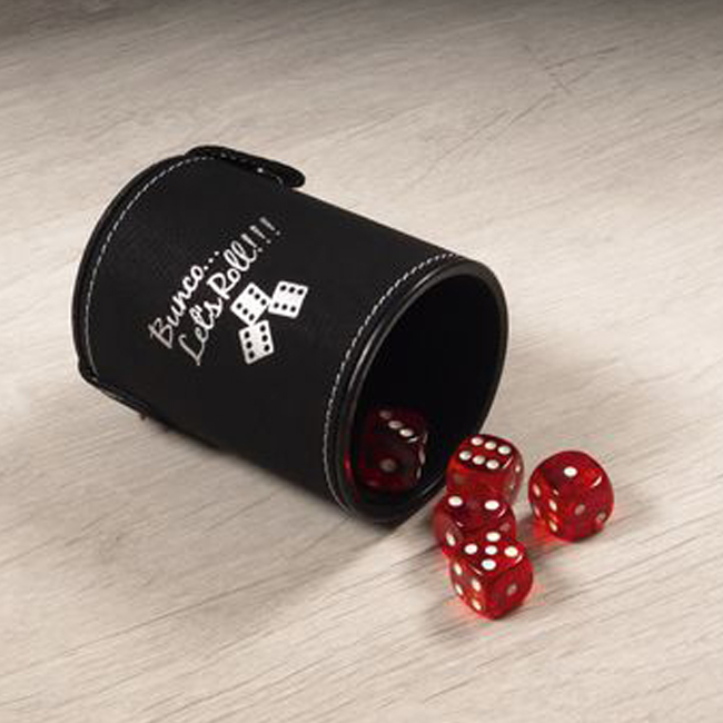 Луксозна кожена кутия с червени зарове за игра на ямб. Забавен и интересен подарък с уникална възможност за брандиране. Специална кожа, която оставя вашето лого/послание в сребърено след лазерно гравиране. Играта е опакована в черна лъскава картонена кутия. Правилата за играта Ямб можете да намерите в Приложените файлове към продукта