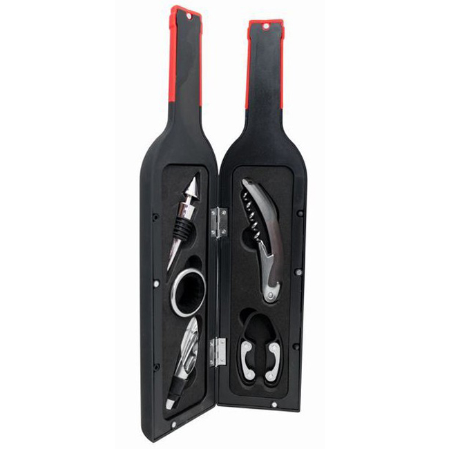 Комплектът е подреден в елегантна и стилна кутия с дизайна на винена бутилка, което го прави идеален изискан подарък за любителите на виното.