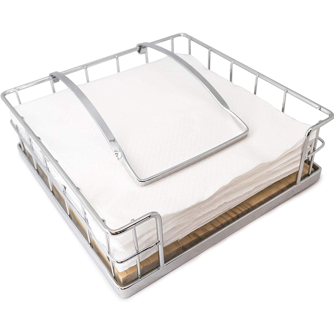 Поставката за салфетки на Nerthus е изработен от неръждаема стона и дърво. Има квадратна форма и големина, достатъчно да събере в себе си всяка стандартна, сгъната на четири салфетка. Скобата позволява салфетките да се фиксират добре върху основата и в същото време да се вземат бързо и лесно.