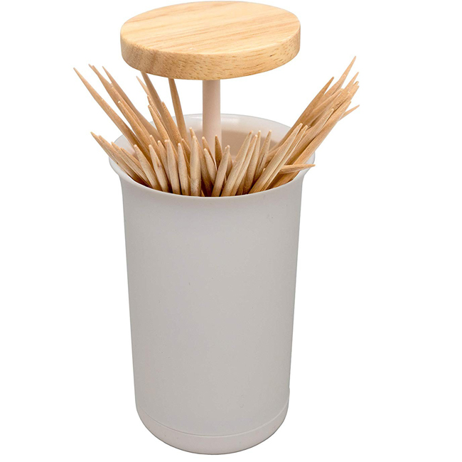Диспенсер за клечки за зъби с автоматична система за отваряне и затваряне. С натискането на капачето можете да отворите диспенсера, да извадите клечка, и с повторното му натискане да го затворите.
