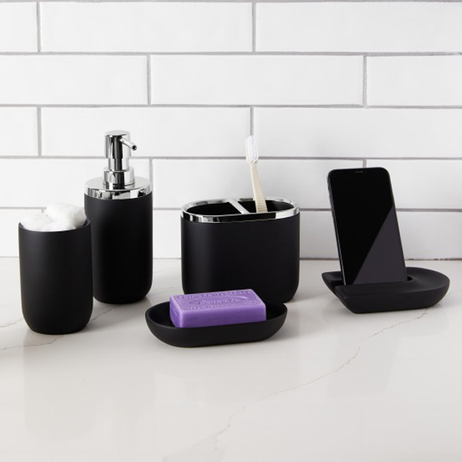 Всички аксесоари от серия JUNIP на UMBRA имат привлекателни заоблени линии, хромирани акценти и привлекателно матово черно покритие. Аксесоарите от колекцията "JUNIP" са проектирани така, че да се допълват. JUNIP е изработен от смола с матово покритие. Разполага с хромиран кант от неръждаема стомана и разделител за отделяне на пастата и четките за зъби