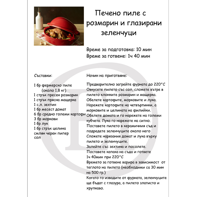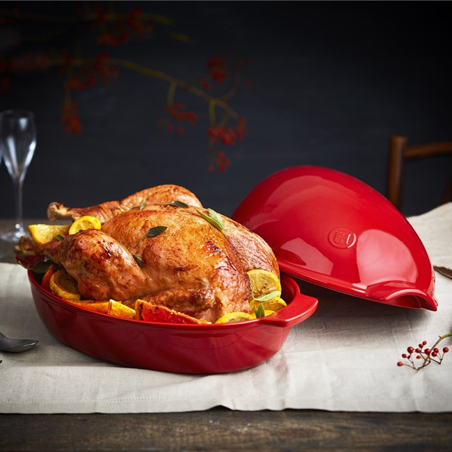Независимо дали става въпрос за пуйка, пиле или агнешко бутче, LARGE ROASTER на EMILE HENRY позволява перфектно готвене на едри домашни птици или друго месо до 5 кг и то без да замърсявате вашата фурна!