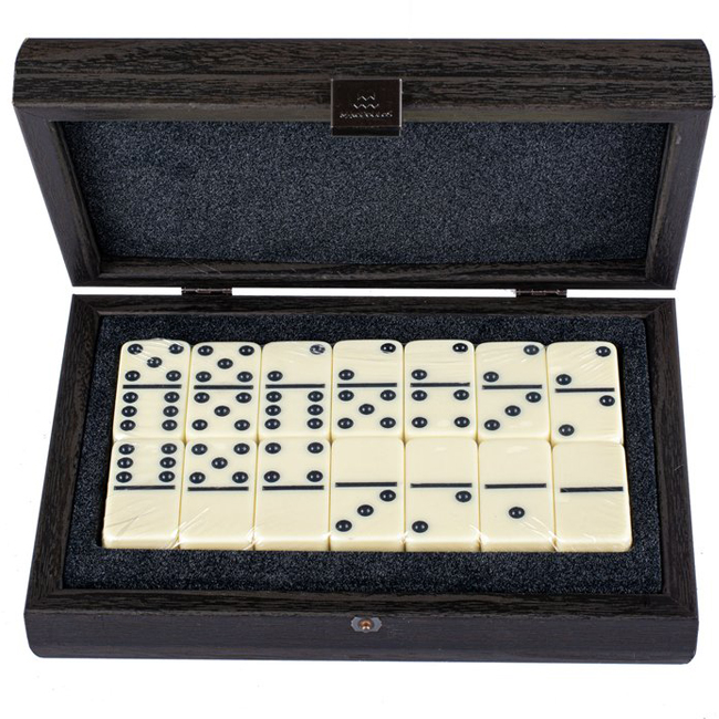 Кутията е изработена от ламинирана дървесина, придаваща уникално докосване и елегантност. В кутията има двадесет и осем плочки за домино с гладко покритие и заоблени ъгли. Кутията е изработена в нашата работилница в Гърция и има велурен интериор.